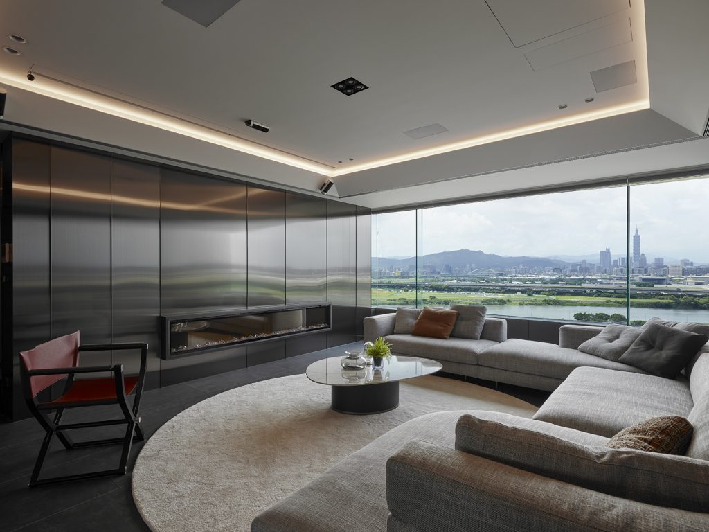位於高樓層的現代風豪宅,最令人驚豔的優勢,便在於能遠眺關渡大橋、享受河岸美景。設計團隊以此為核心,跳脫制式的設計手法,打破窗面的界線外,也不被「門」的傳統概念綑綁,讓屋主無論置身何處,都可以望見波光粼粼的自然風光。而內部視覺,不但運用蛋形、斜面天花,挑戰一般對空間的想像,也利用特殊工藝堆疊淺色塗料,搭襯純白石材,將焦點留在外部景緻,寫下寧靜低調的美好日常。